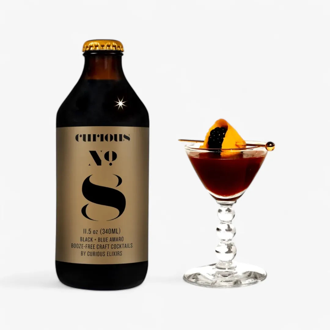 Curious Elixir No. 8 is a non-alcoholic, ready-to-pour cocktail inspired by a spiced Manhattan. This rich, velvety elixir blends smoky lapsang tea, warming clove and chili, and a hint of cherry with a base of dark cherry, bitter herbs, and complex spices. Fortified with adaptogens like ashwagandha and damiana, it's designed to support relaxation and mood while delivering a slow-sipping, spirit-free indulgence.