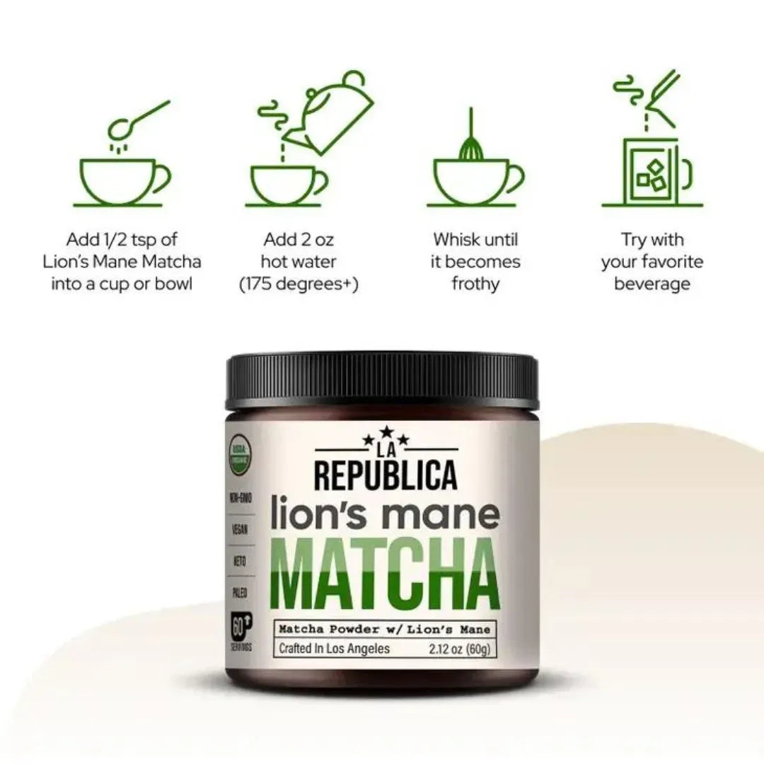 La Republica Lion’s Mane Matcha blends premium Japanese matcha with brain-boosting lion’s mane mushroom for a calm, focused energy hit. This vibrant green powder delivers smooth, grassy flavor and adaptogenic support—perfect for powering through work, study, or meditation without the crash.