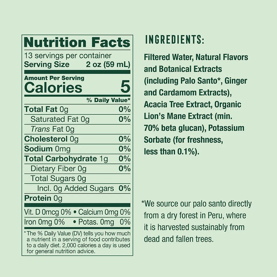 Inspired by the flavors of Mezcal and infused with mood-enhancing lion's mane, St. Ember is the first functional N/A spirit in the Tequila and Mezcal categories. With a sophisticated, first-of-its-kind flavor profile of palo santo—a surprising blend of wood and fennel—ginger, cardamom and vanilla, St. Ember surprises with an added pepper-y bite that won't get diluted in your favorite cocktails. Boosted with 100mg lion's mane per serving, St. Ember brings a noticeable brain boost to a rich and nuanced sensory experience. Little Saints sources the most potent organic Lion's Mane mushroom extract on the market, which is 70% beta glucan, extracted via ultrasound and up to 700x more potent than the average mushroom powder. Sourced in the USA from a USDA organic family farm. Little Saints sources its palo santo directly from northern Peru, where the palo santo is harvested from dead and fallen trees by the community surrounding the palo santo forest. Little Saints is a proud 1% for the Planet partner and donates to reforestation efforts in Peru. Sip as a prelude to pleasure.