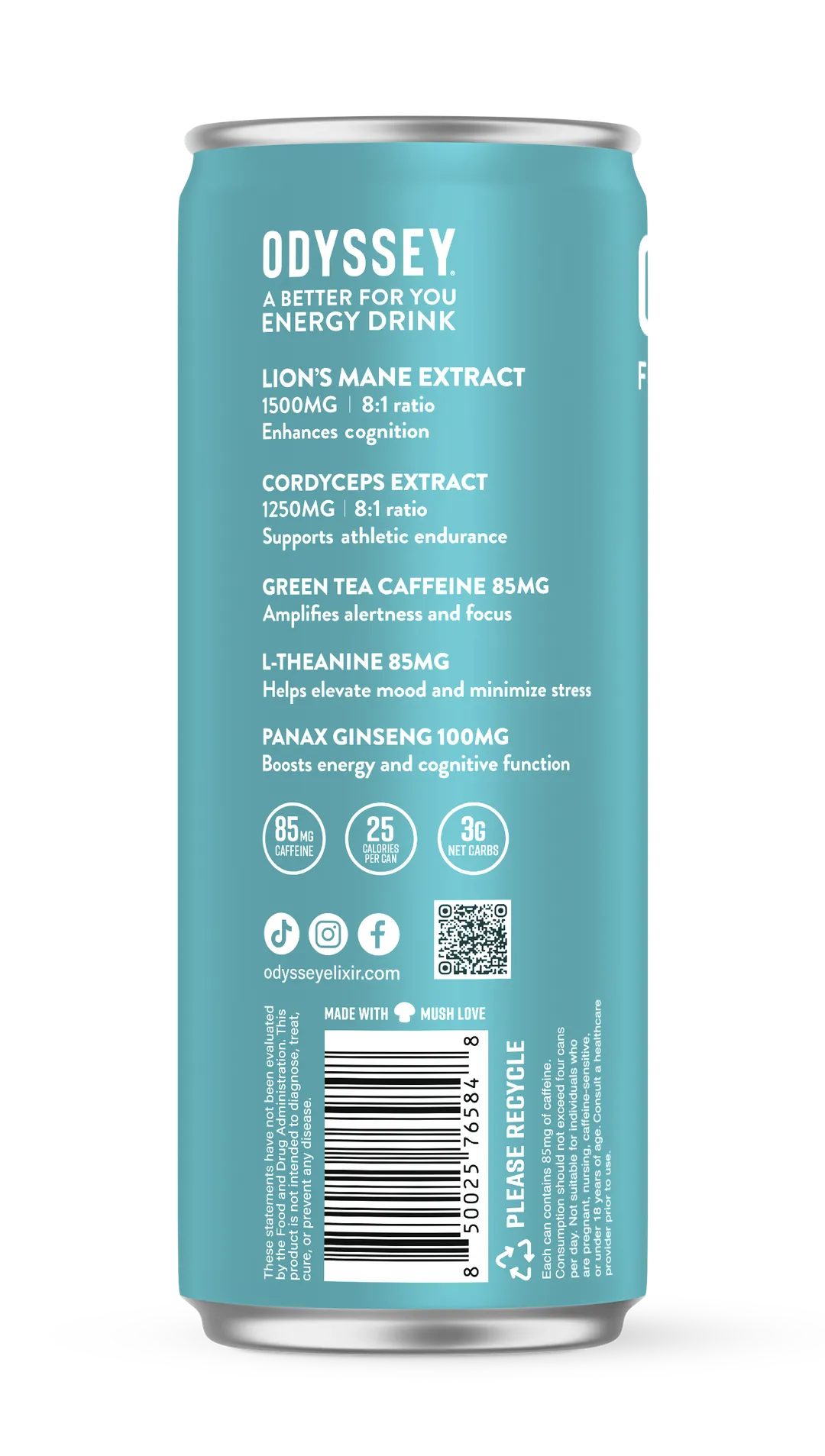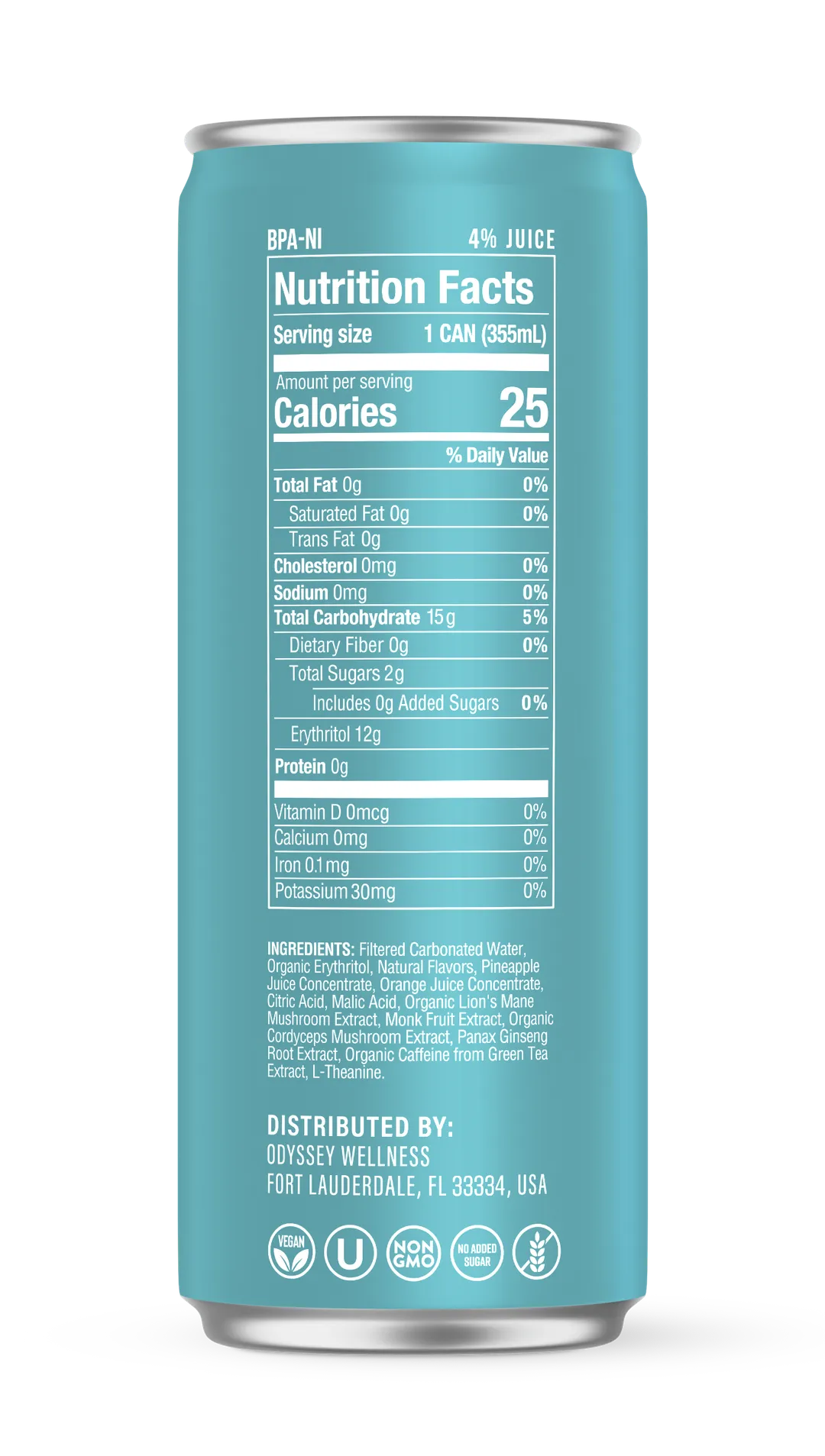 Odyssey Elixir proudly presents Tropical - Odyssey Functional Energy. This beverage is not just a drink, it's a revolution in energy enhancement. We utilize high potency ingredients like Lion’s Mane, Cordyceps, L-theanine, and Panax Ginseng, known for boosting cognition, energy, and mood. Our formula is free from artificial sweeteners and preservatives, ensuring a natural and healthy boost. Savor the exceptional tropical flavor while experiencing a new wave of vitality. Refresh yourself with a burst of functional energy.