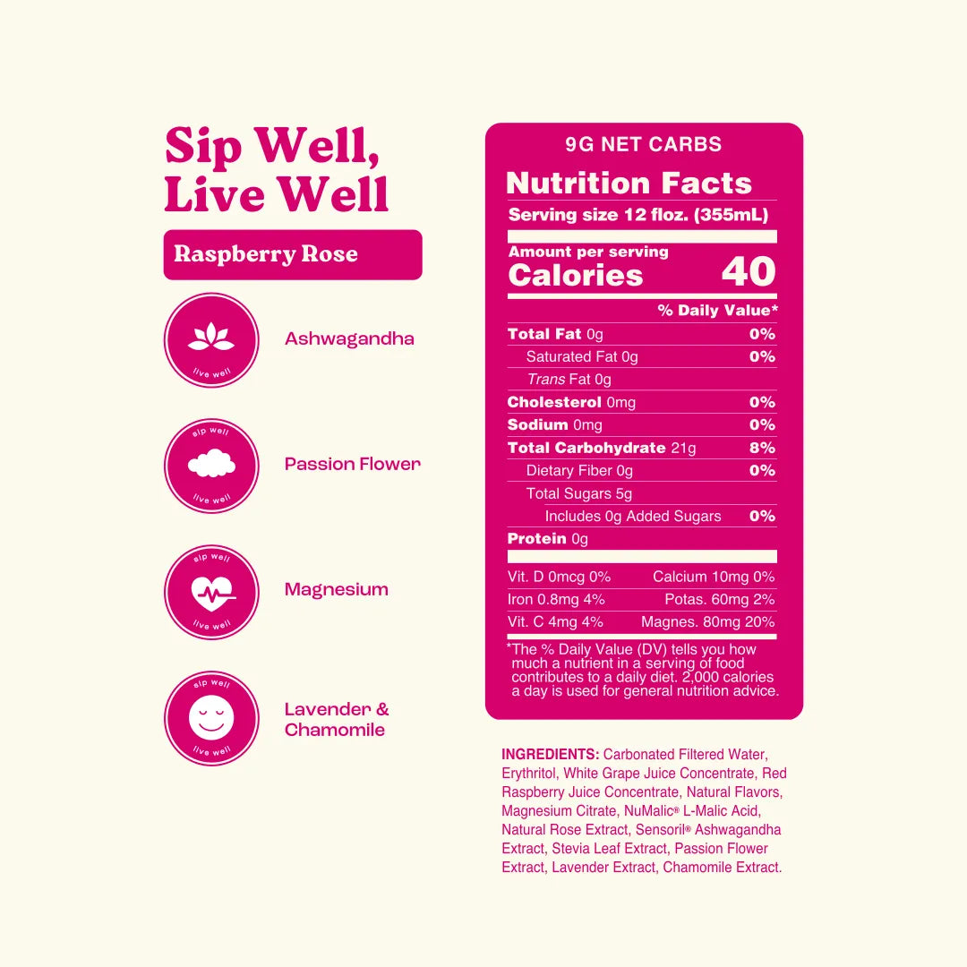The best-tasting magnesium-infused adaptogenic non-alcoholic social tonic! ☁️ Real fruit flavors and REAL ingredients ☁️ 5 powerful ingredients, promised to give you relaxation. ☁️ 80mg of Ashwagandha, a highly potent adaptogen. ☁️ Lightly sparkled with real raspberry & rose ☁️ 80mg of Magnesium Citrate to ease tension <3 ☁️ Non-habit-forming ingredients.